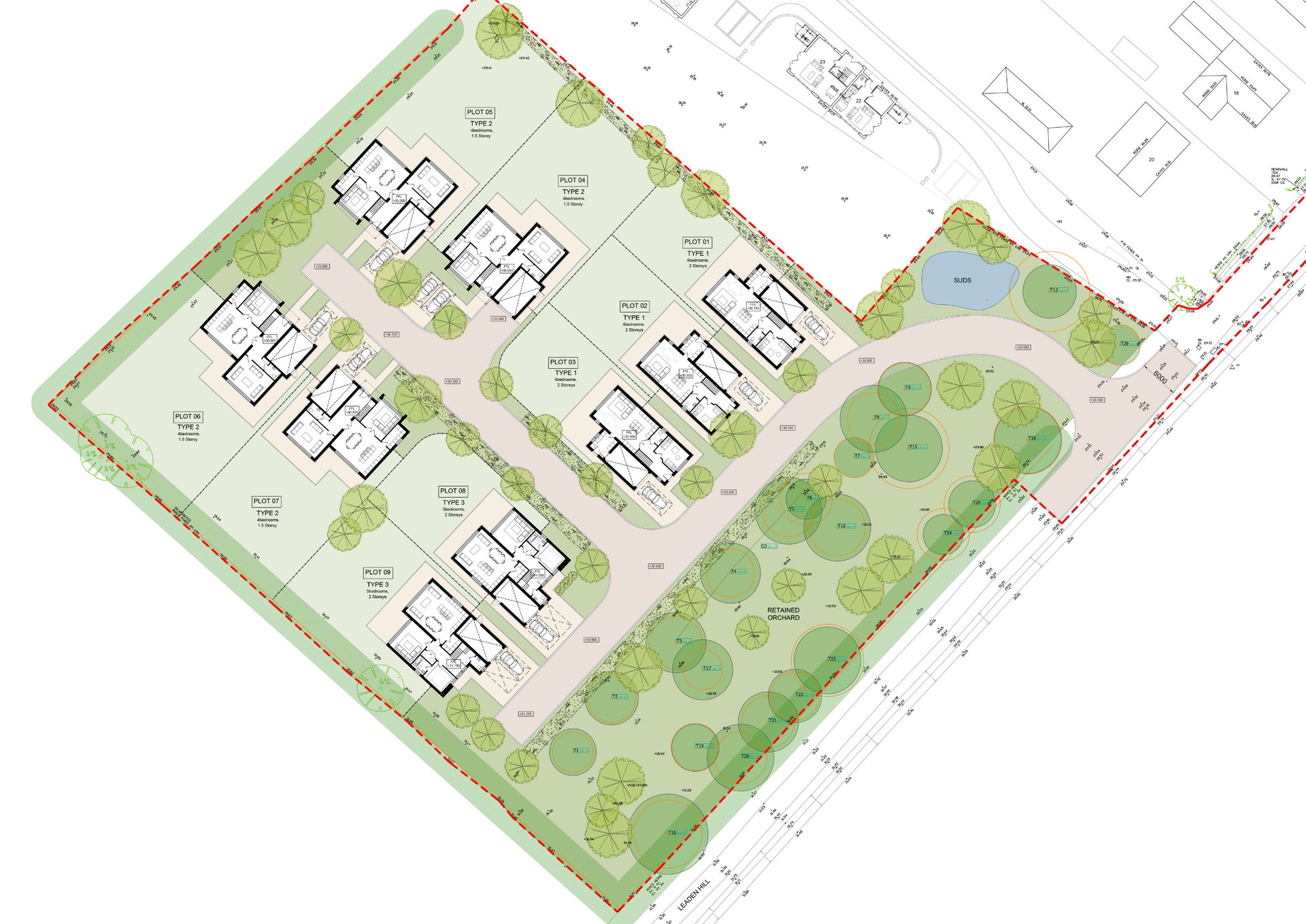 This is an outline planning application, with vehicular access from Leaden Hill included at this stage. The internal infrastructure, comprising the access road, landscaping, and site frontage, will form the first phase of the project and be detailed in a future Reserved Matters application. Subsequent phases will cover individual dwelling plots, allowing for bespoke design within defined design parameters. Each plot will be subject to its own Reserved Matters application, giving future homeowners the flexibility to create homes that reflect their needs and preferences.