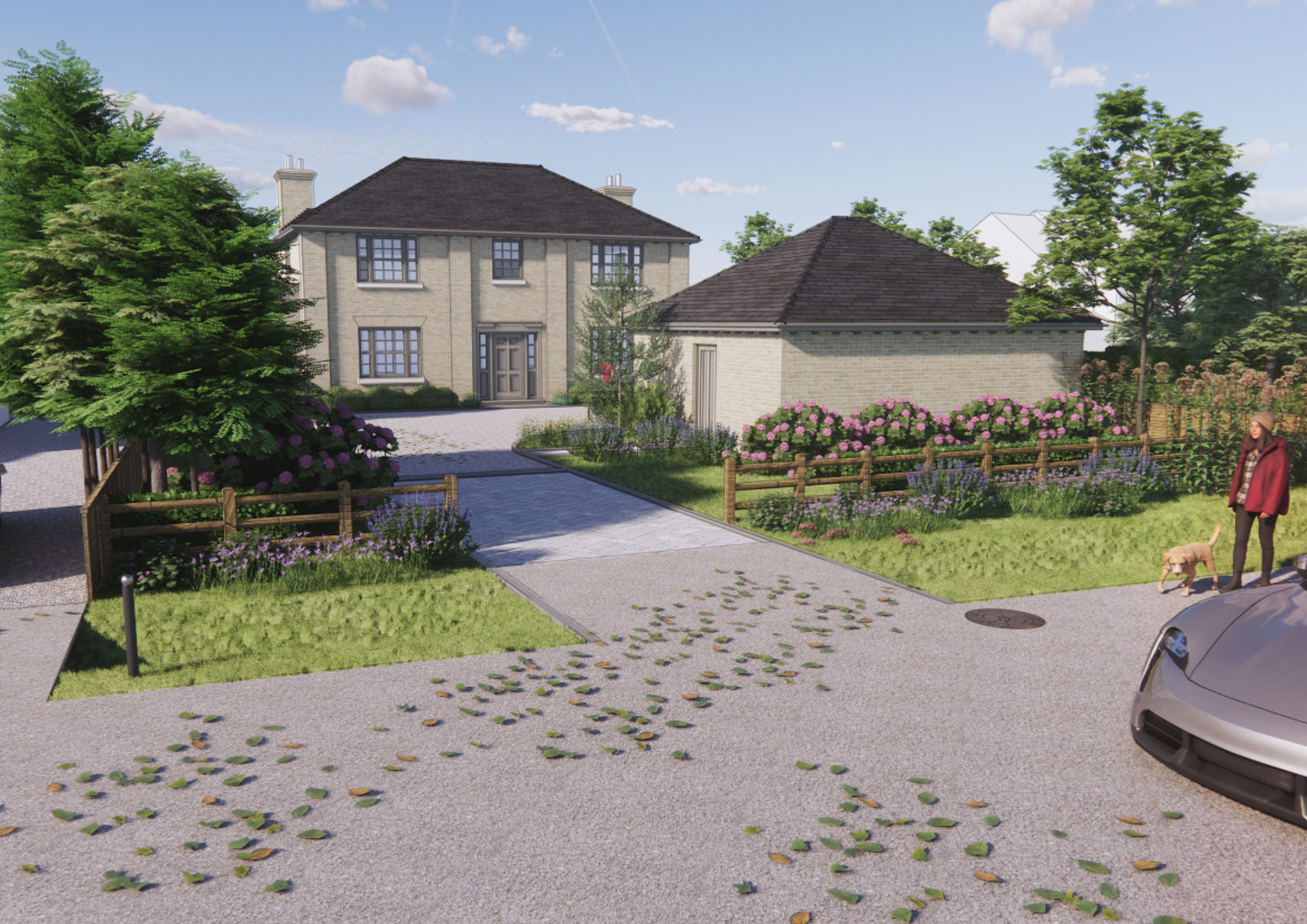 The siting of the dwelling has been carefully considered in relation to its approach and wider landscape. Positioned at the end of a driveway with multiple heritage assets, the house is introduced in a measured and modest reveal that enhances a sense of arrival. The entrance is framed by landscaping designed to emphasize the approach sequence, creating an elegant threshold between the shared drive and the private curtilage. A defined frontage is established through estate fencing and a hedge set behind to soften the boundary and provide a sense of enclosure. Within this frontage, a generous driveway allows space for visitor parking and turning, while also offering access to two integral garage spaces, which are connected internally to the main house for convenience.