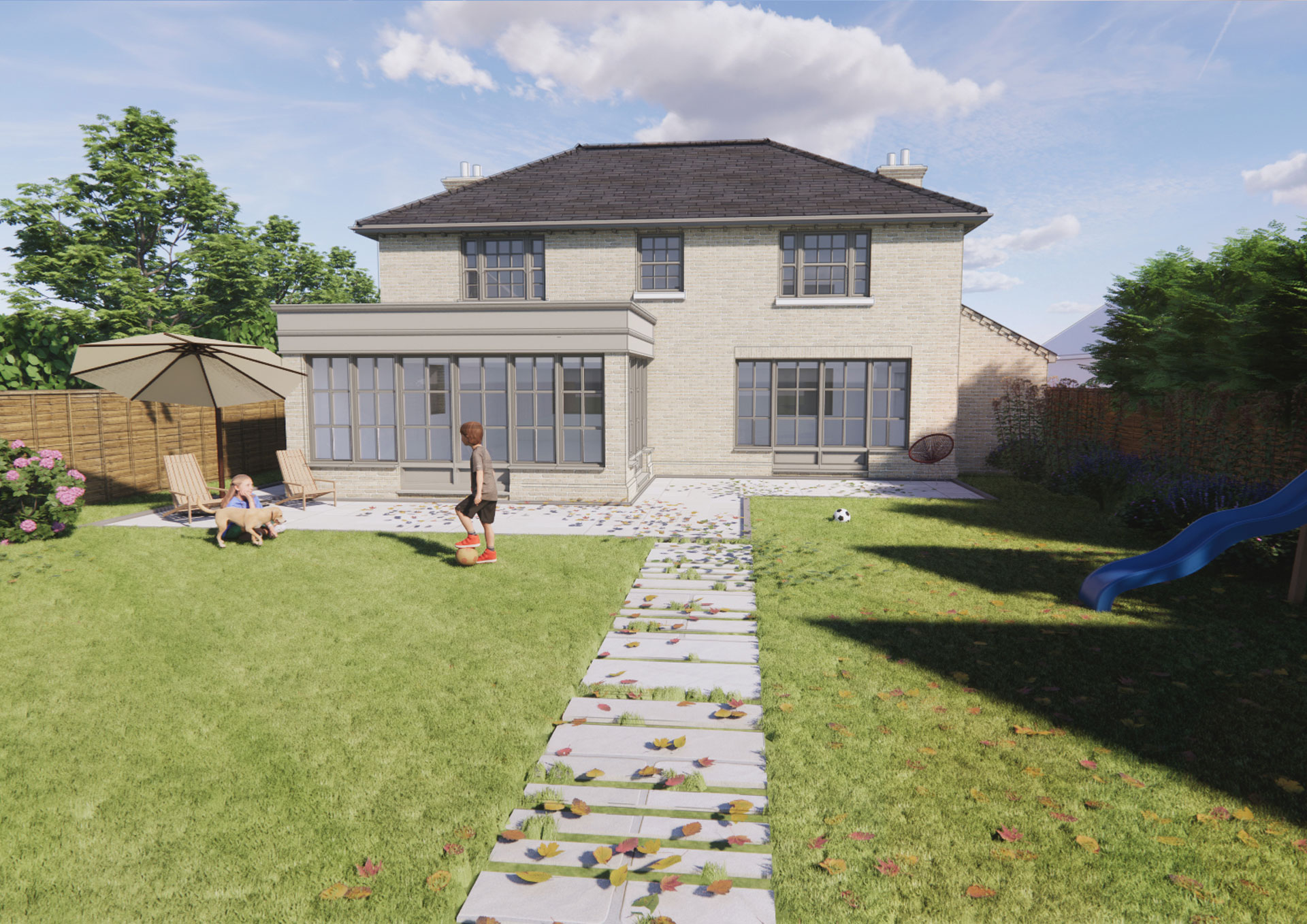 This proposal is for a new five-bedroom family dwelling with detached double garage, conceived as an impeccably detailed traditional home designed to meet the demands of modern living. The architectural approach combines classical balance and restraint with contemporary expectations for comfort, efficiency, and adaptability.