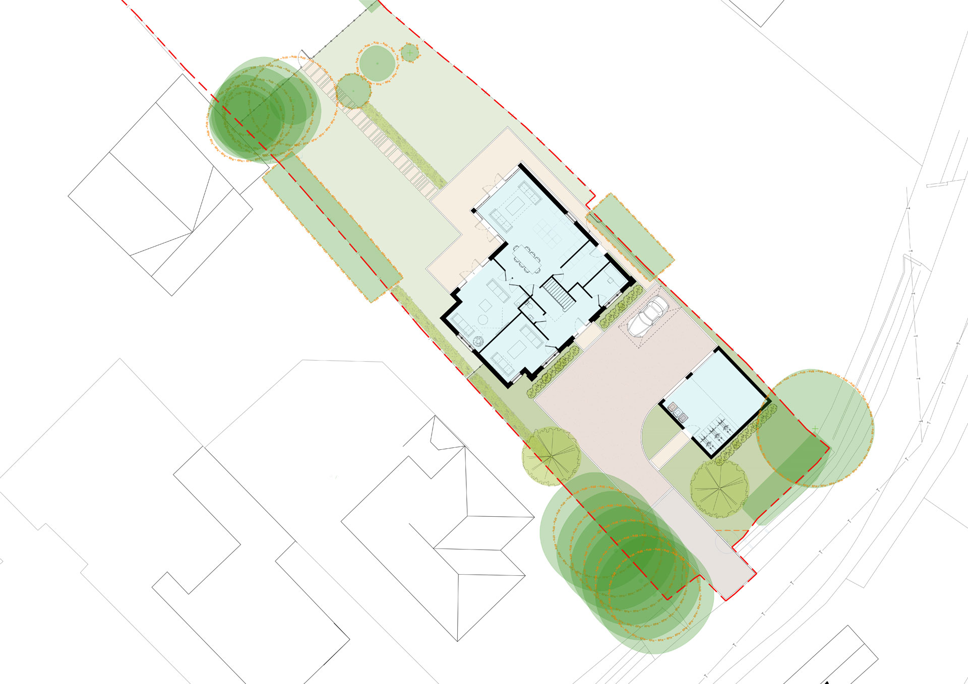 The dwelling has been planned to distinguish clearly between public and private realms. The front elevation addresses the approach, while the rear of the house opens towards the paddocks, allowing principal living spaces to enjoy long views across the landscape. Existing trees both within and around the site have been retained and celebrated, with the footprint of the house carefully positioned to avoid intrusion into any root protection zones. The landscaping strategy works in tandem with the architecture to reinforce a sense of permanence and settlement.