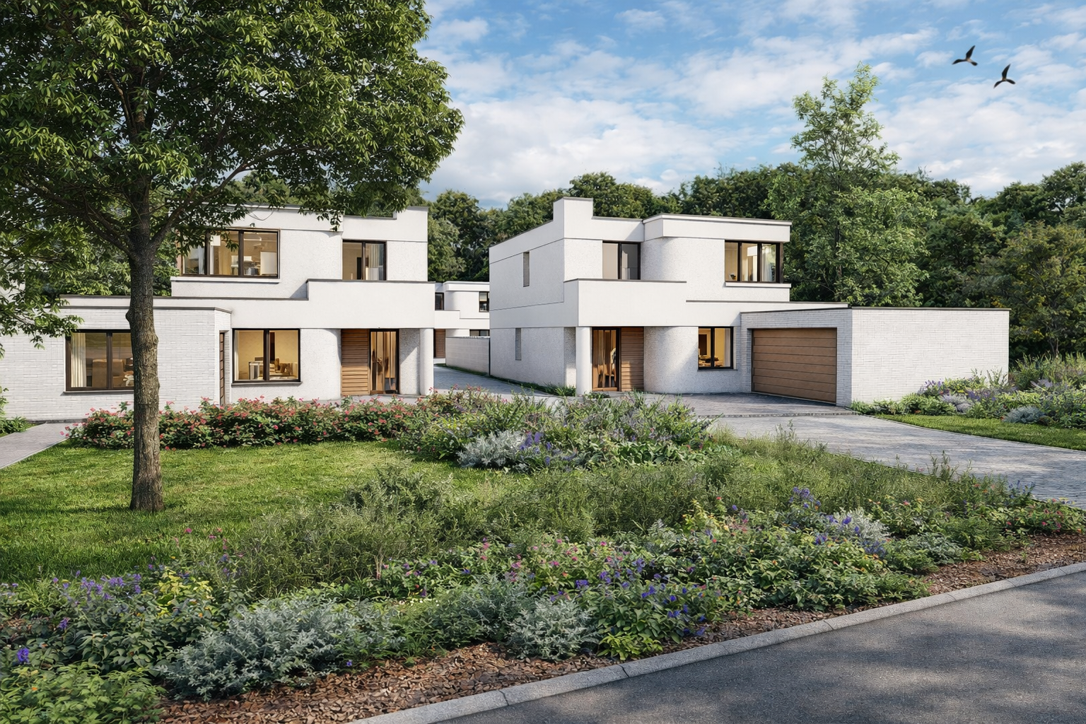 Landscape Integration: The site is thoughtfully planned to enhance privacy, maximize natural light, and integrate harmoniously with the neighborhood. Outdoor spaces with native landscaping add a sense of serenity and a family-friendly atmosphere.